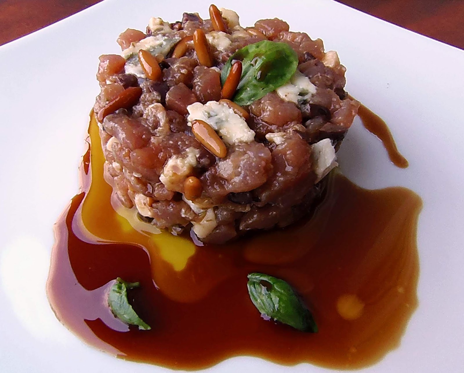 U nastalu emulziju od varenika, ulja i soka limuna umiješajte kockice tune, popaprite ih, dodajte narezane Kalamate i kapare, sve dobro izmiješajte i dobro ohladite oko sat vremena u hladnjaku. Ohlađeno izvadite i umiješajte već posve mekanu Gorgonzolu i tostirane pinjole koji su bili na sobnoj temperaturi. Dodajte najnježnije, male, listiće bosiljka. Ukalupite i servirajte, a s vrha u posljednji tren posolite s još malo cvijeta soli i skromno dodajte još malo varenika i ulja. Poslužite uz bruschete.